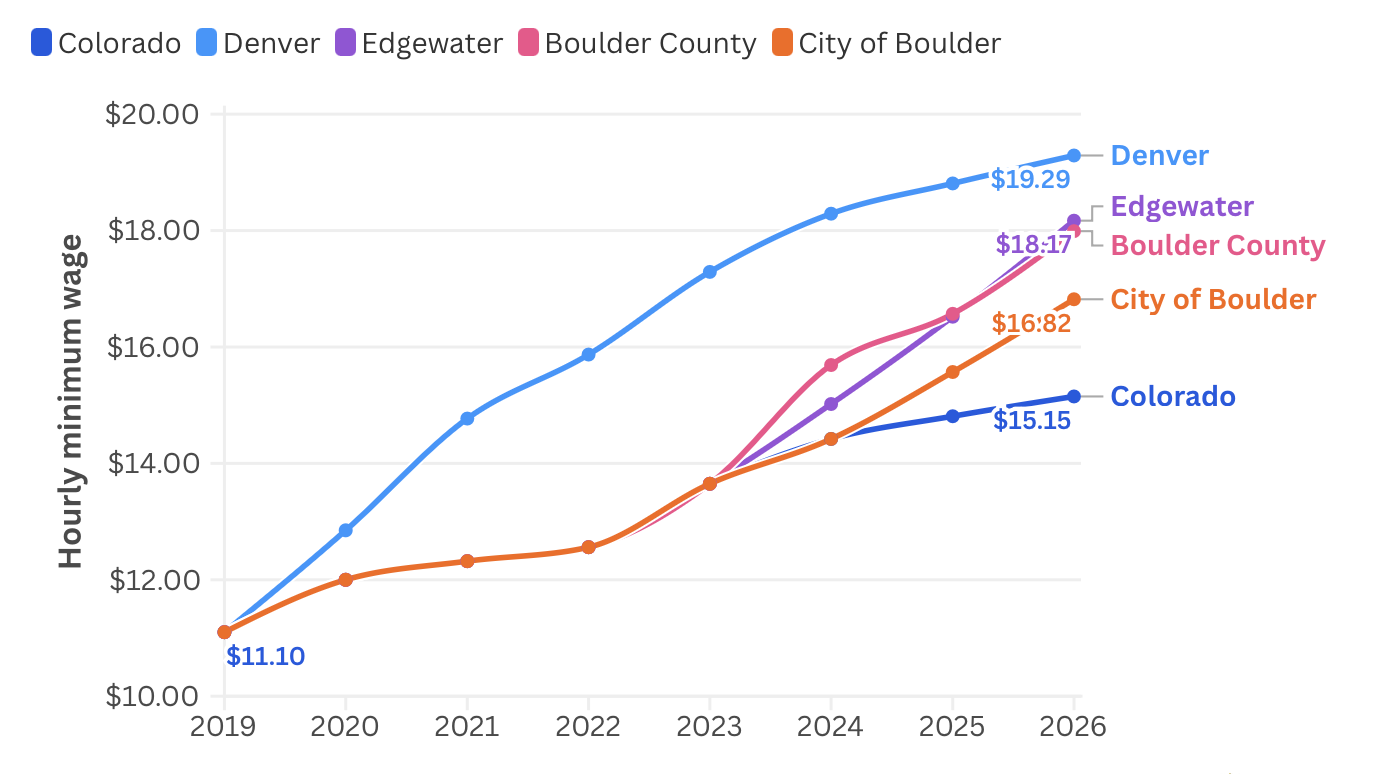 Since 2019, Colorado law has allowed local governments to raise the minimum wage for all workers, not just municipal employees.